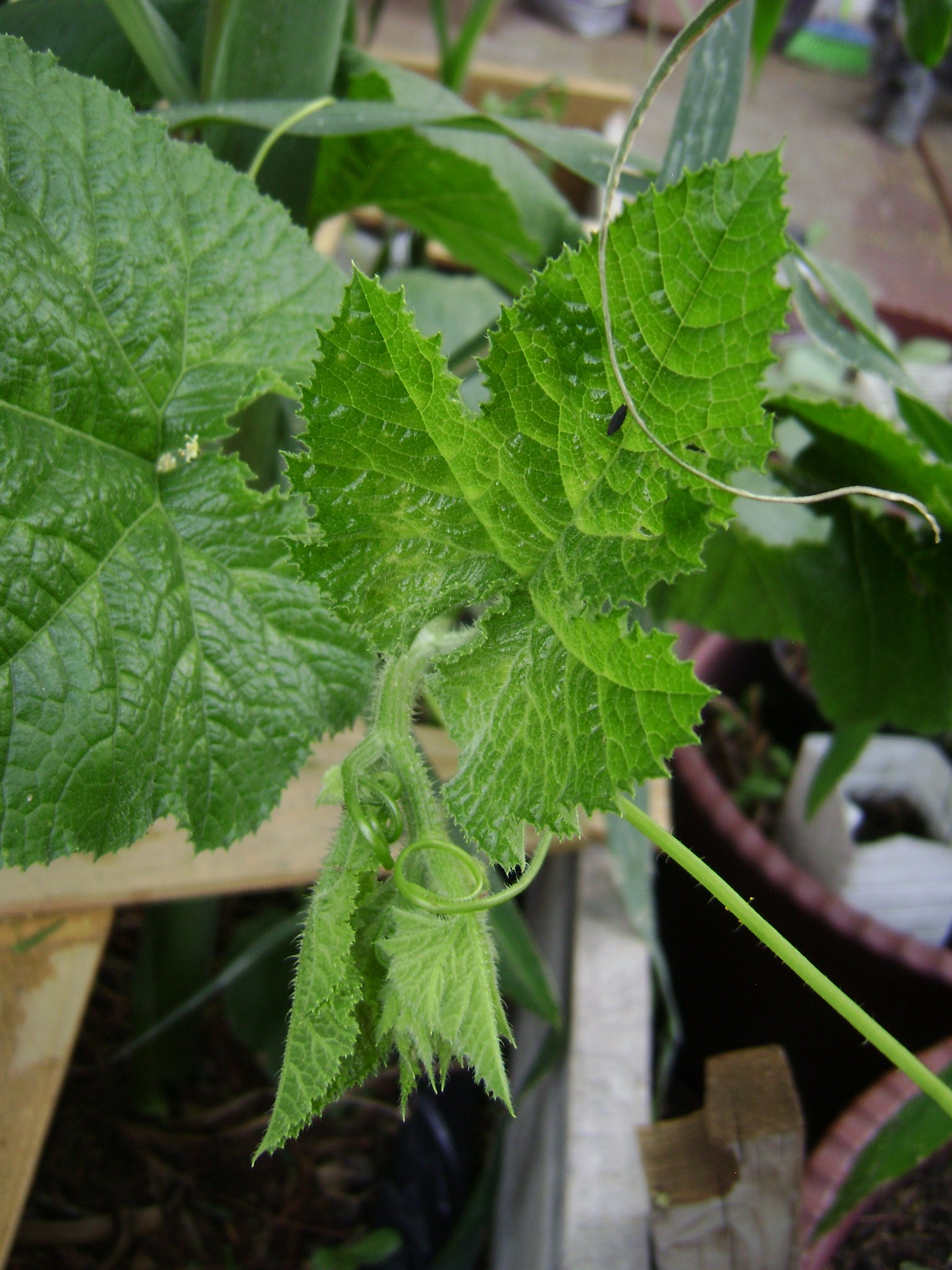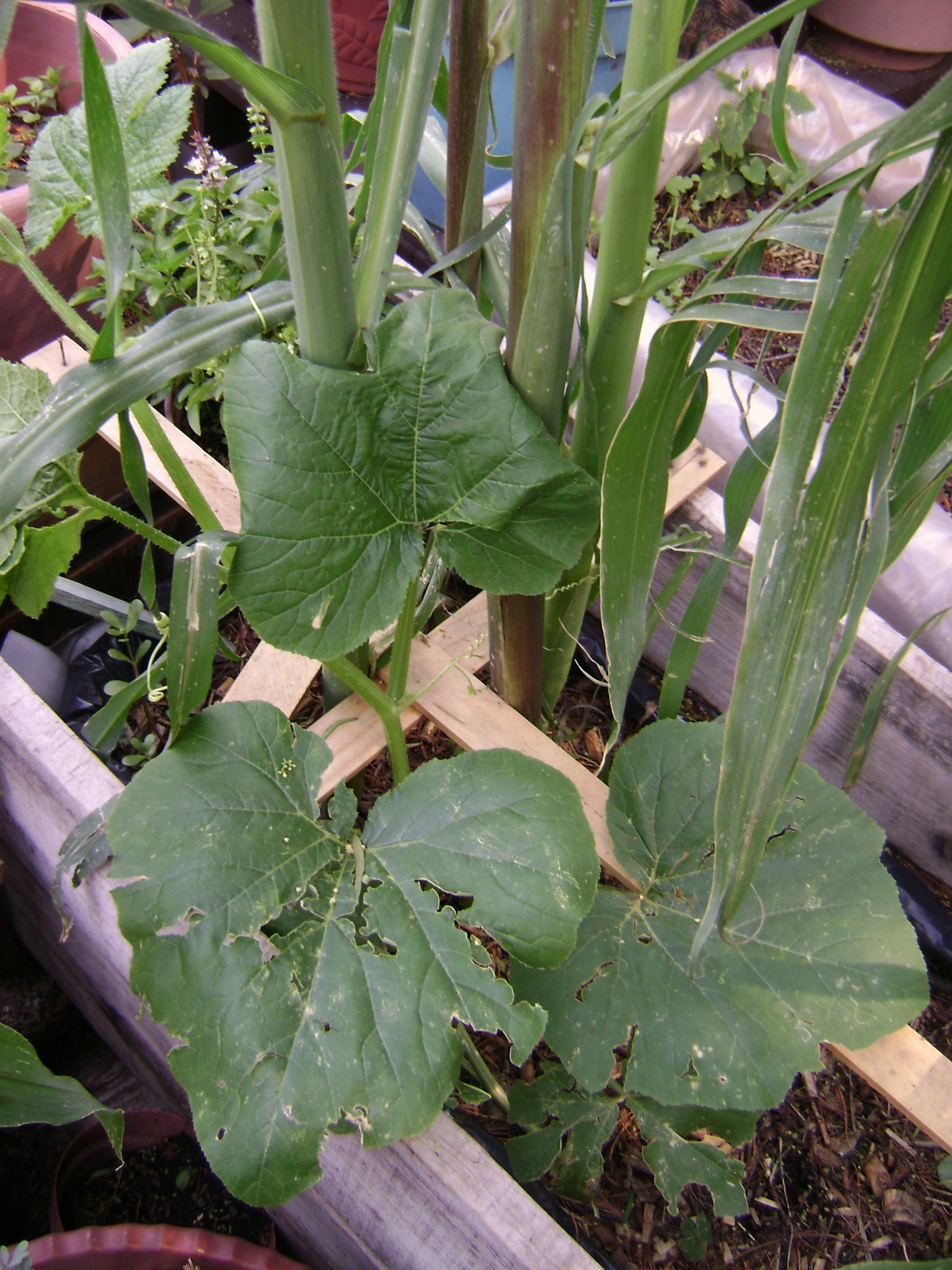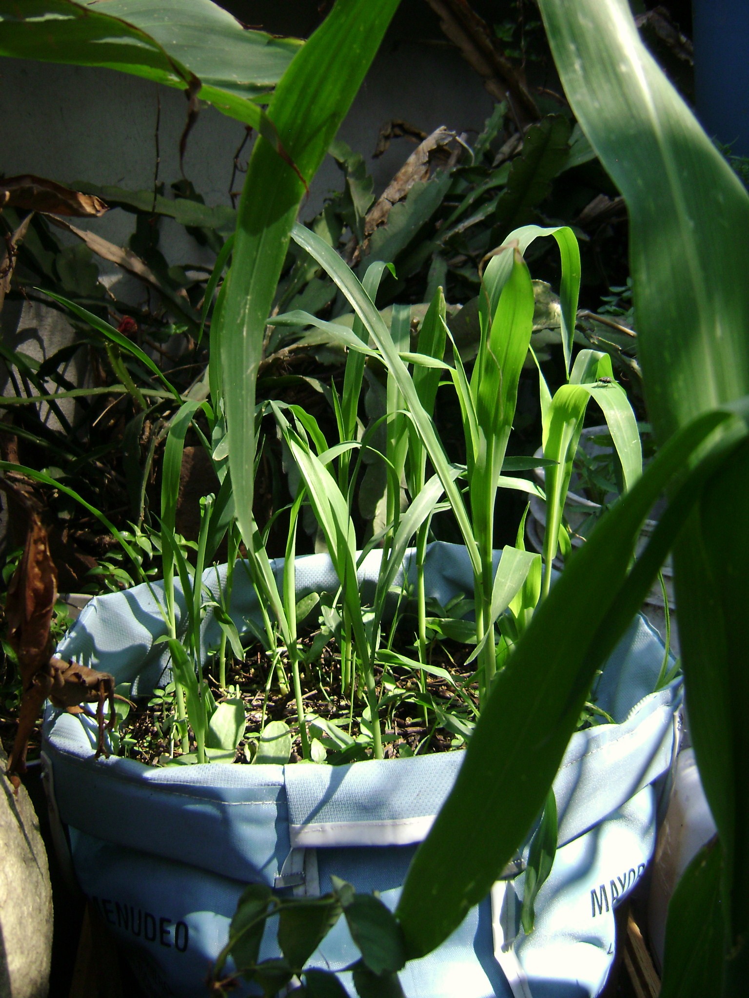 Otros varios días después, ya se mira el cambio de suelo, tal como lo muestran las imágenes de arriba. La bolsa de la carnicería, también conocida como la milpa vagabunda, tiene ya un montón de cañitas verdes, matizadas con los cotiledones de varios calabacines sonajeros. El bote de lache es un éxito en menos 20cm de profundidad, un suelo rico en materia orgánica, baja temperatura, humedad constante, el HDPE resulta ser un hule clorado que evita la colonización de bacterias y hongos en sus paredes. Por otro lado, la calabaza y el maíz de setenta días, vilipendiadxs por las indolentes condiciones climáticas, por fin se han encontrado en su milenario abrazo, les mando uno.